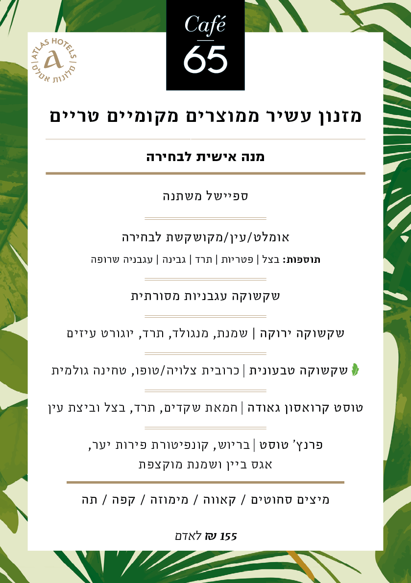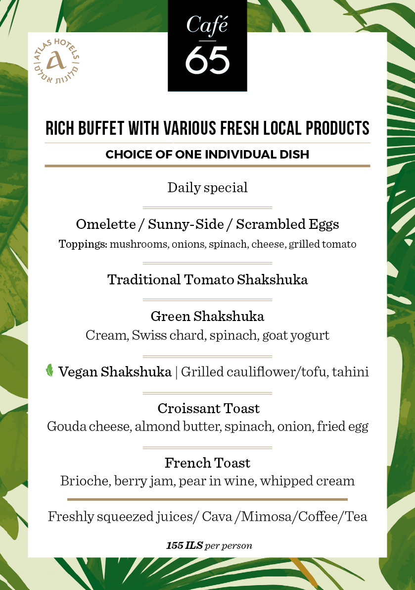 בשעות הבוקר מציע קפה 65 לקהל הרחב בראנץ' הכולל מזנון מגוון, ססגוני ואלגנטי אליו נלווית מנה אישית לבחירה מתוך התפריט.